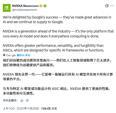 针对谷歌母公司Alphabet取得进展的报道,英伟达发言人回应称,公司对谷歌在AI领域的进步感到高兴并继续向其供货,但他强调: