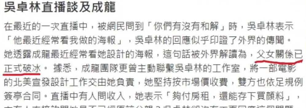 26岁的吴卓林近期多次现身直播,话语不多,神情颇为平静。有粉丝询问她与成龙的关系是否有所缓和,她只是淡淡地回应道:他最近常看我做的海报。就这一句话,又被港媒大肆渲染。